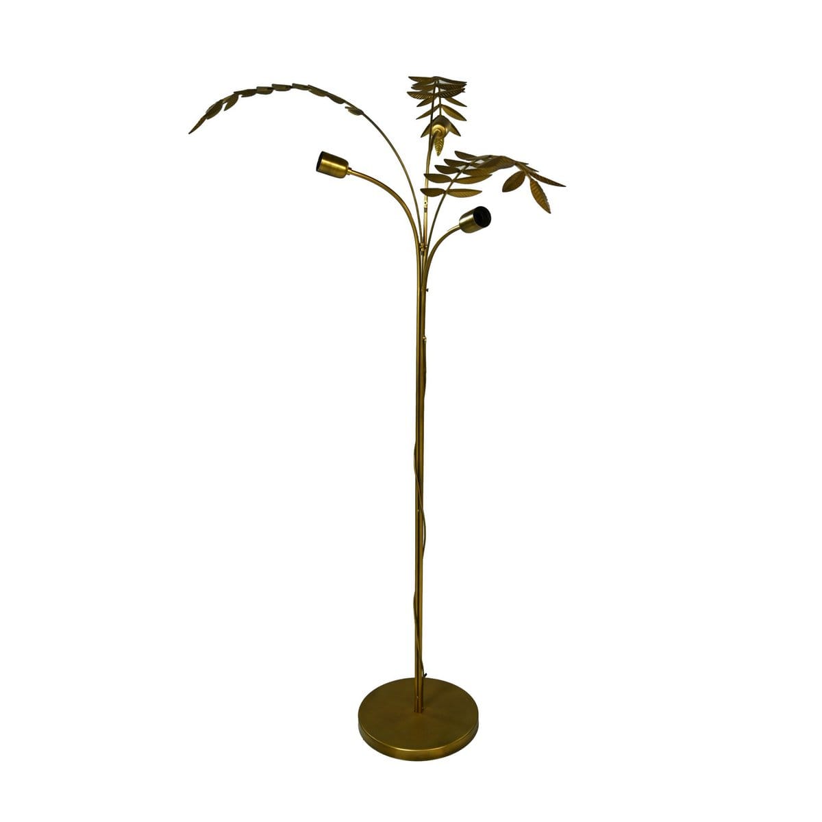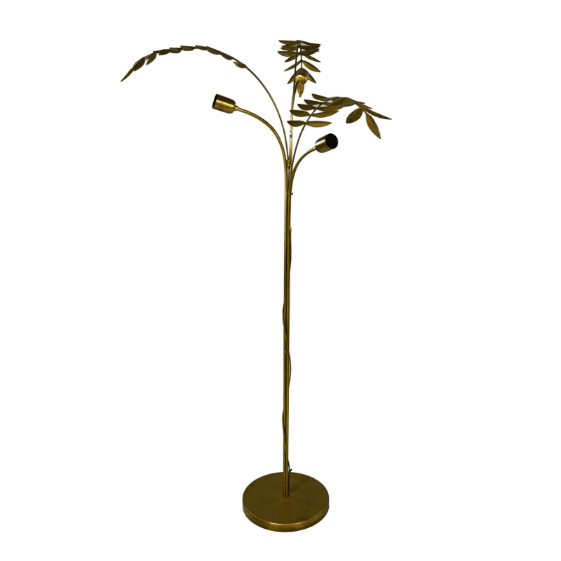 Wat een geweldige vloerlamp! Het metalen frame heeft de vorm van een palmboom en is afgewerkt met een prachtige gouden finish. De bijzondere staande vloerlamp heeft een ronde voet en een hoogte van 150 cm. Deze lamp geeft elke kamer een bijzondere twist!